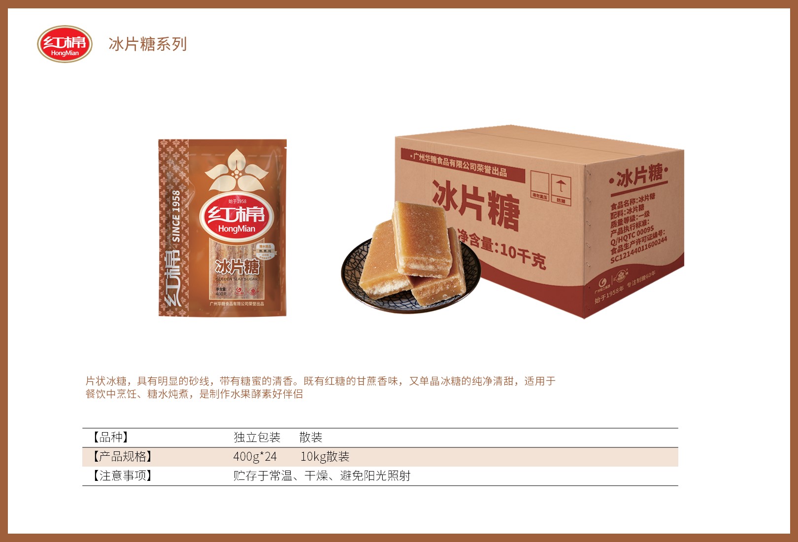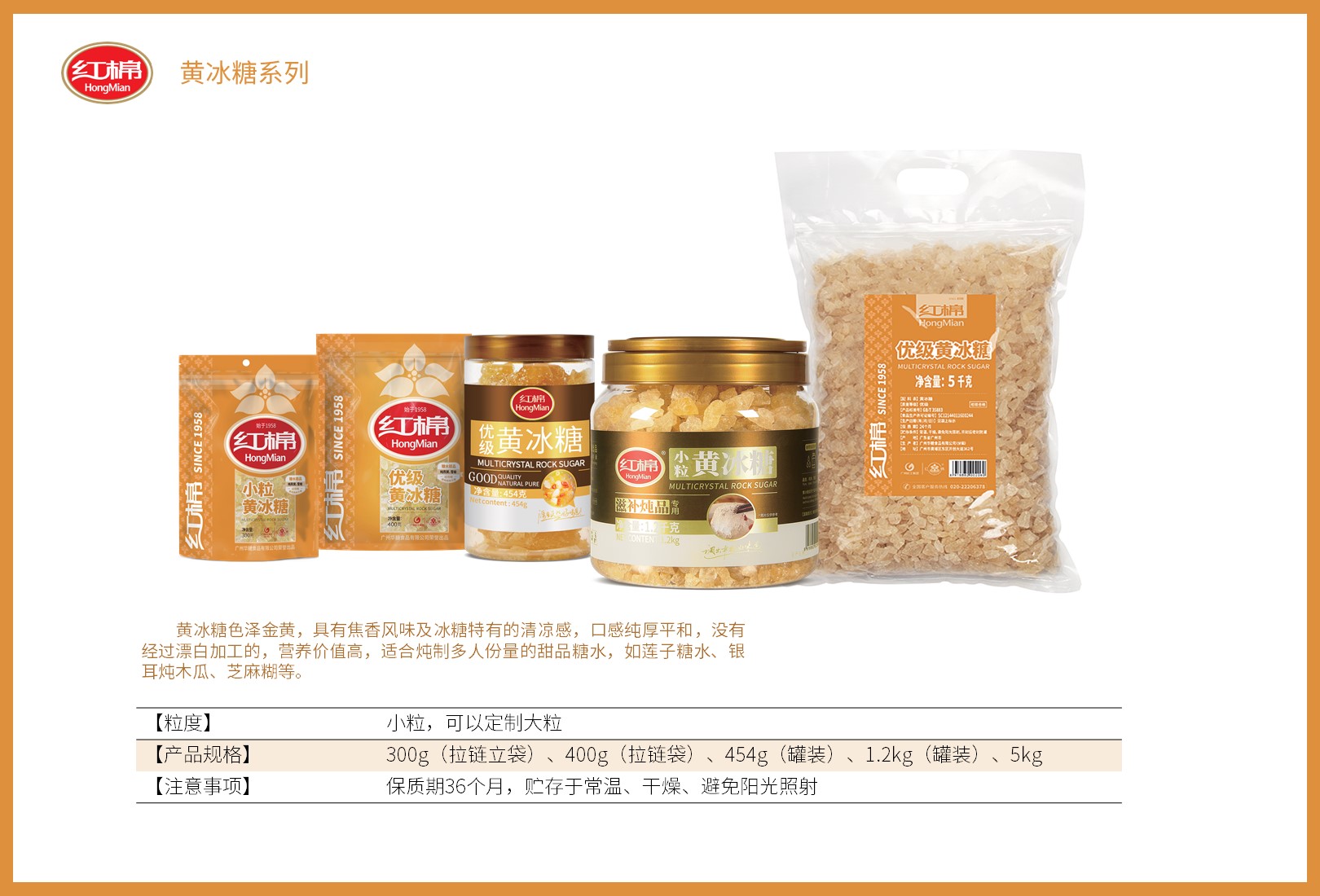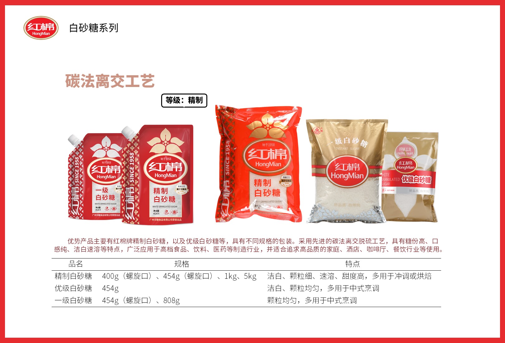 红棉产品 2021-12-13 红棉 浏览: 43 “红棉”品牌源自1955年,秉承“专业做好糖”的匠心准则,将已有数百年历史的我国古法制糖工艺与现代科技相结合;传承,并借助标准化科学化的管理模式严把食品安全质量关,多年来企业不断创新发展丰富了红棉牌产品链,推出红棉精制糖、红棉红糖、红棉黑糖、红棉冰糖等以优良品质深受广大消费者喜爱。