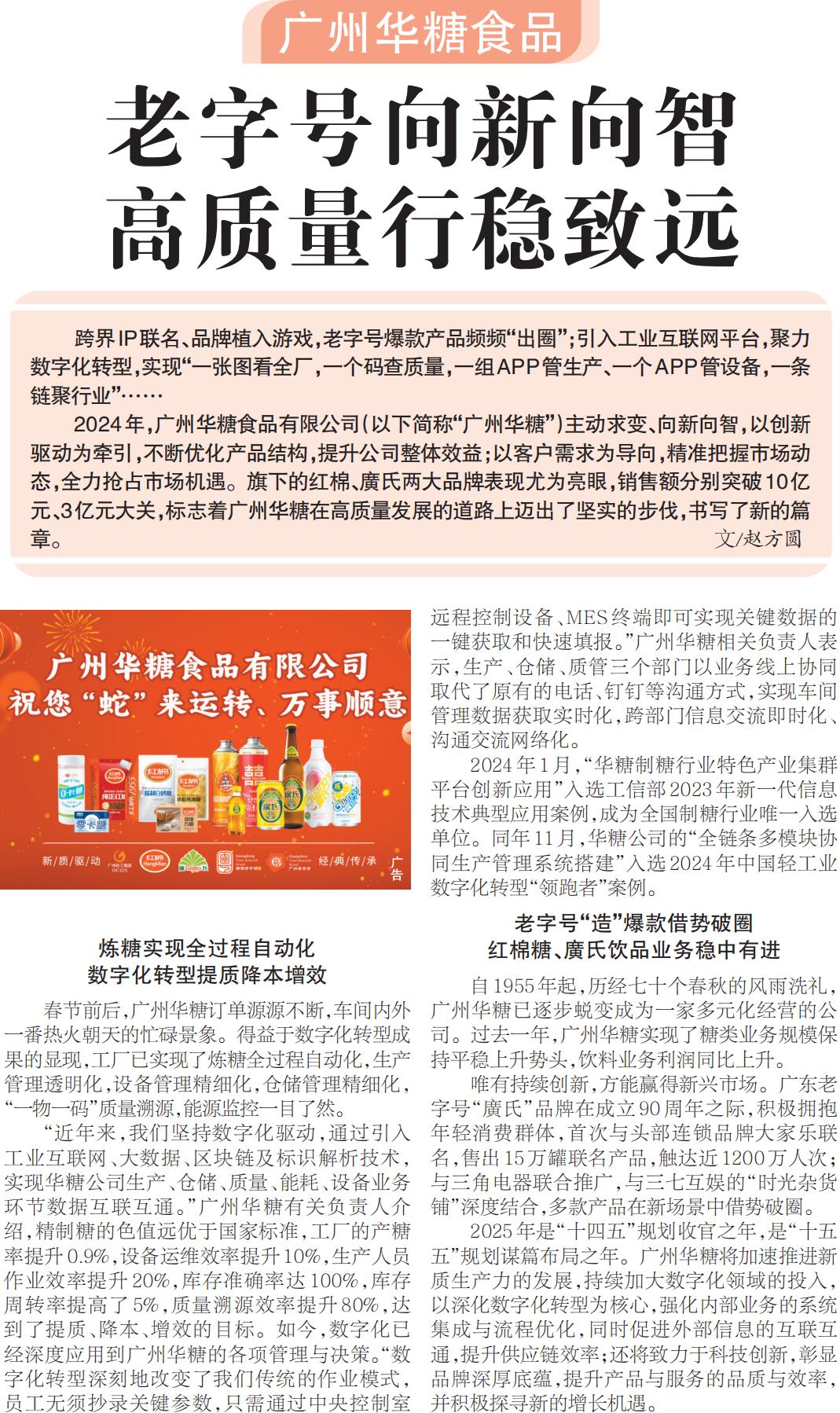 2024年,广州华糖食品有限公司(以下简称“广州华糖”)主动求变、向新向智,以创新驱动为牵引,不断优化产品结构,提升公司整体效益;以客户需求为导向,精准把握市场动态,全力抢占市场机遇。旗下的红棉、廣氏两大品牌表现尤为亮眼,销售额分别突破10亿元、3亿元大关,标志着广州华糖在高质量发展的道路上迈出了坚实的步伐,书写了新的辉煌篇章。