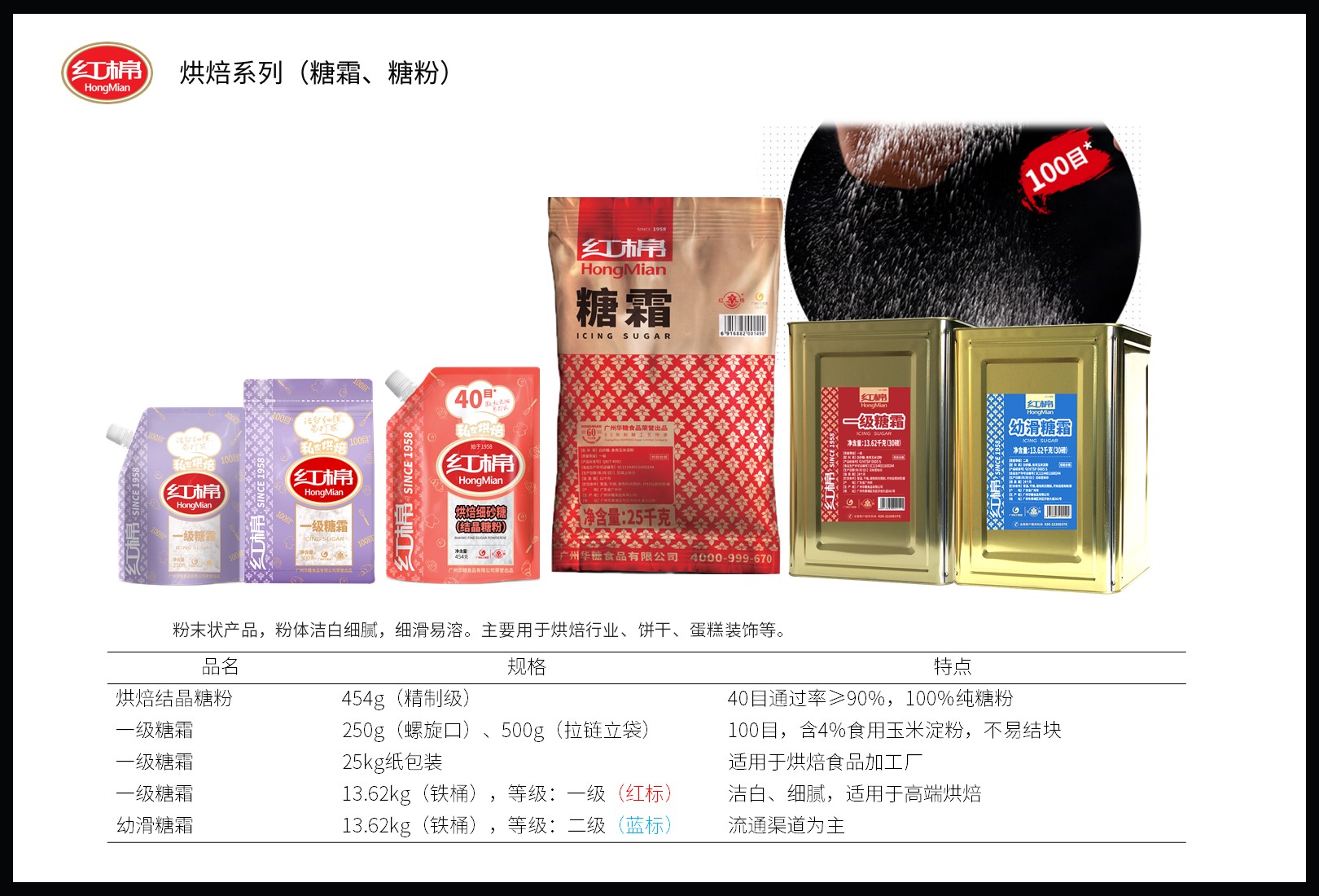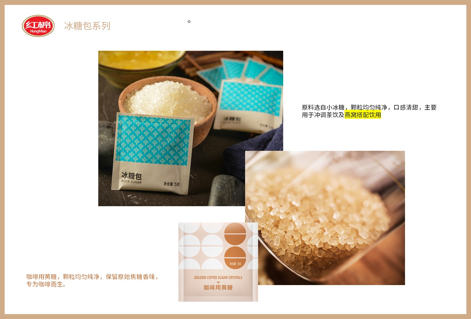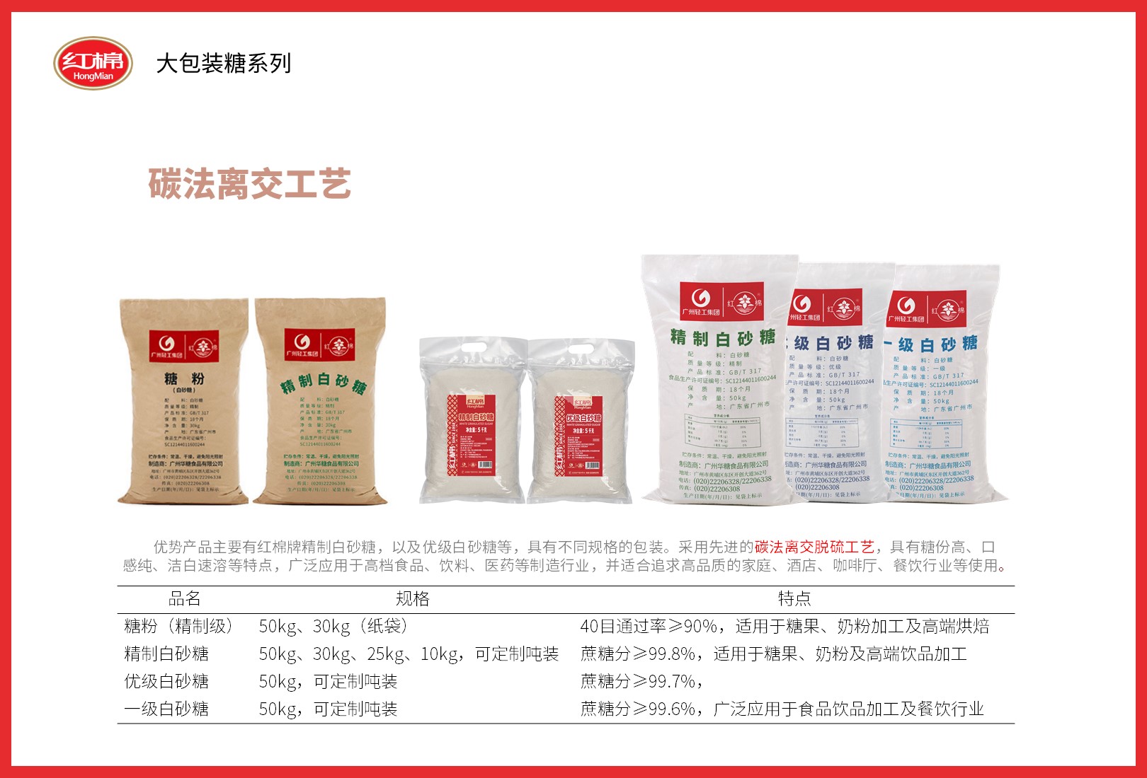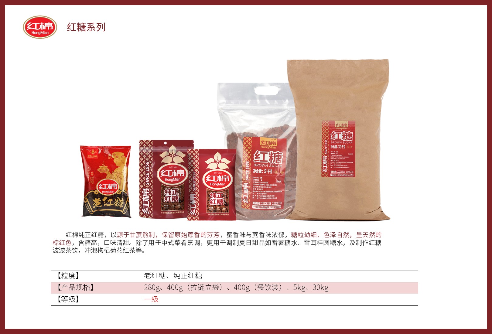 红棉产品 2021-12-13 红棉 浏览: 42 “红棉”品牌源自1955年,秉承“专业做好糖”的匠心准则,将已有数百年历史的我国古法制糖工艺与现代科技相结合;传承,并借助标准化科学化的管理模式严把食品安全质量关,多年来企业不断创新发展丰富了红棉牌产品链,推出红棉精制糖、红棉红糖、红棉黑糖、红棉冰糖等以优良品质深受广大消费者喜爱。