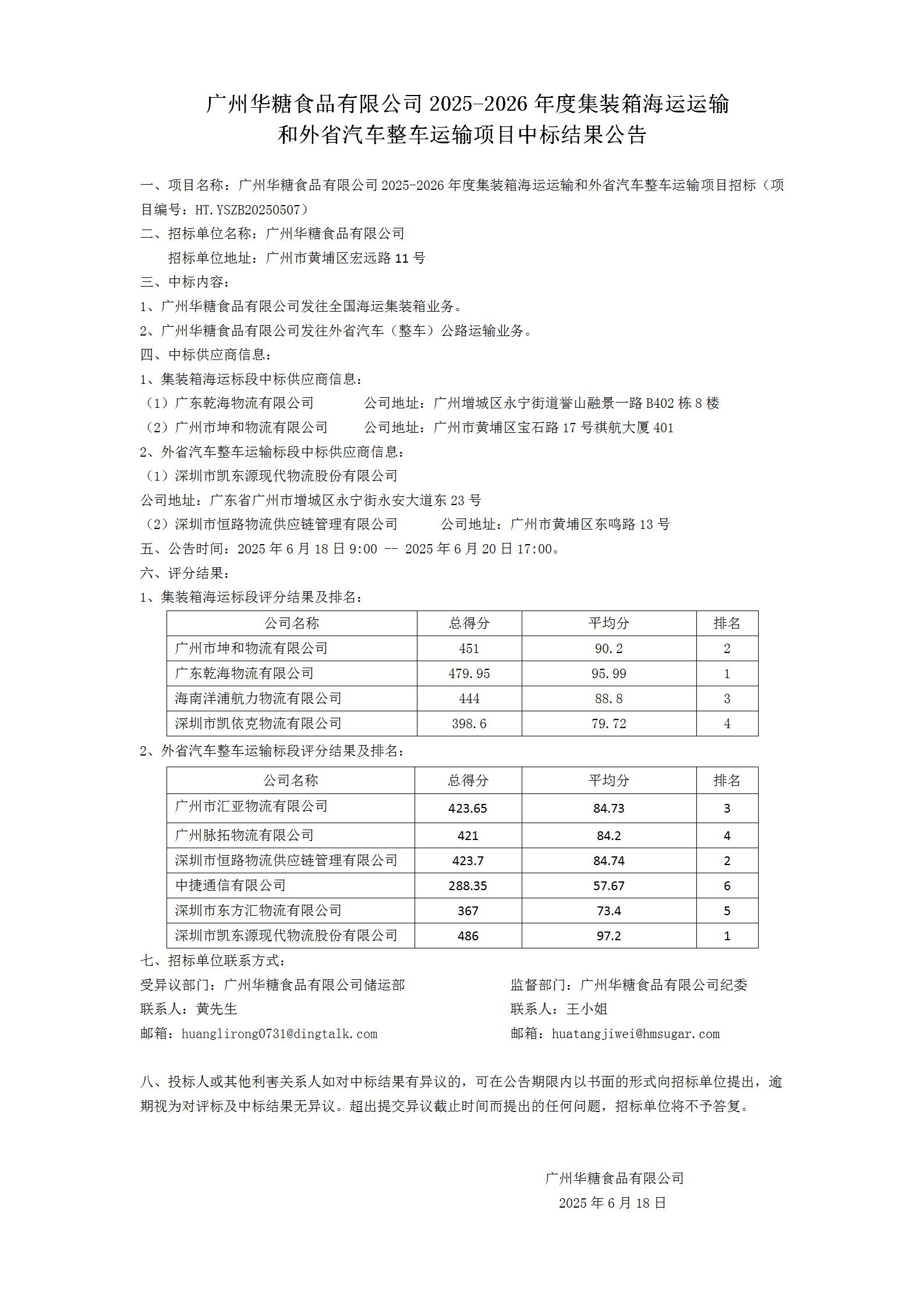广州华糖食品有限公司2025-2026年度集装箱海运运输和外省汽车整车运输项目中标结果公告