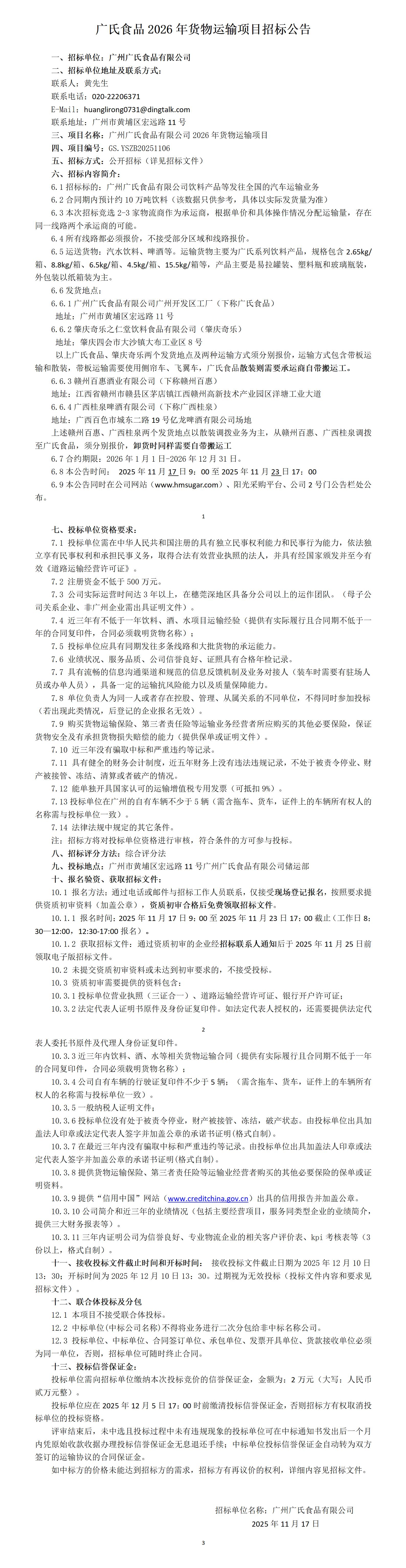 广氏食品2026年货物运输项目招标公告
